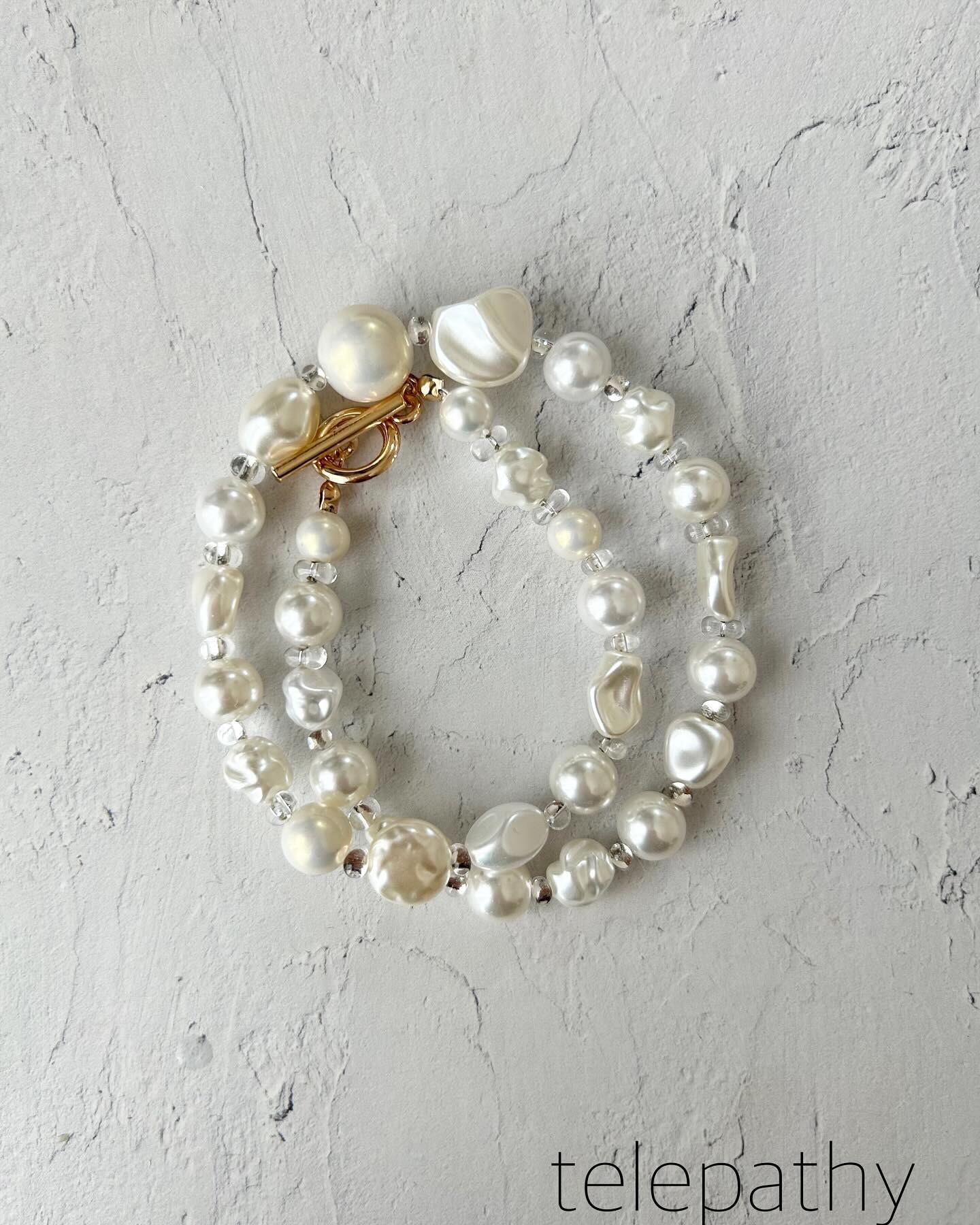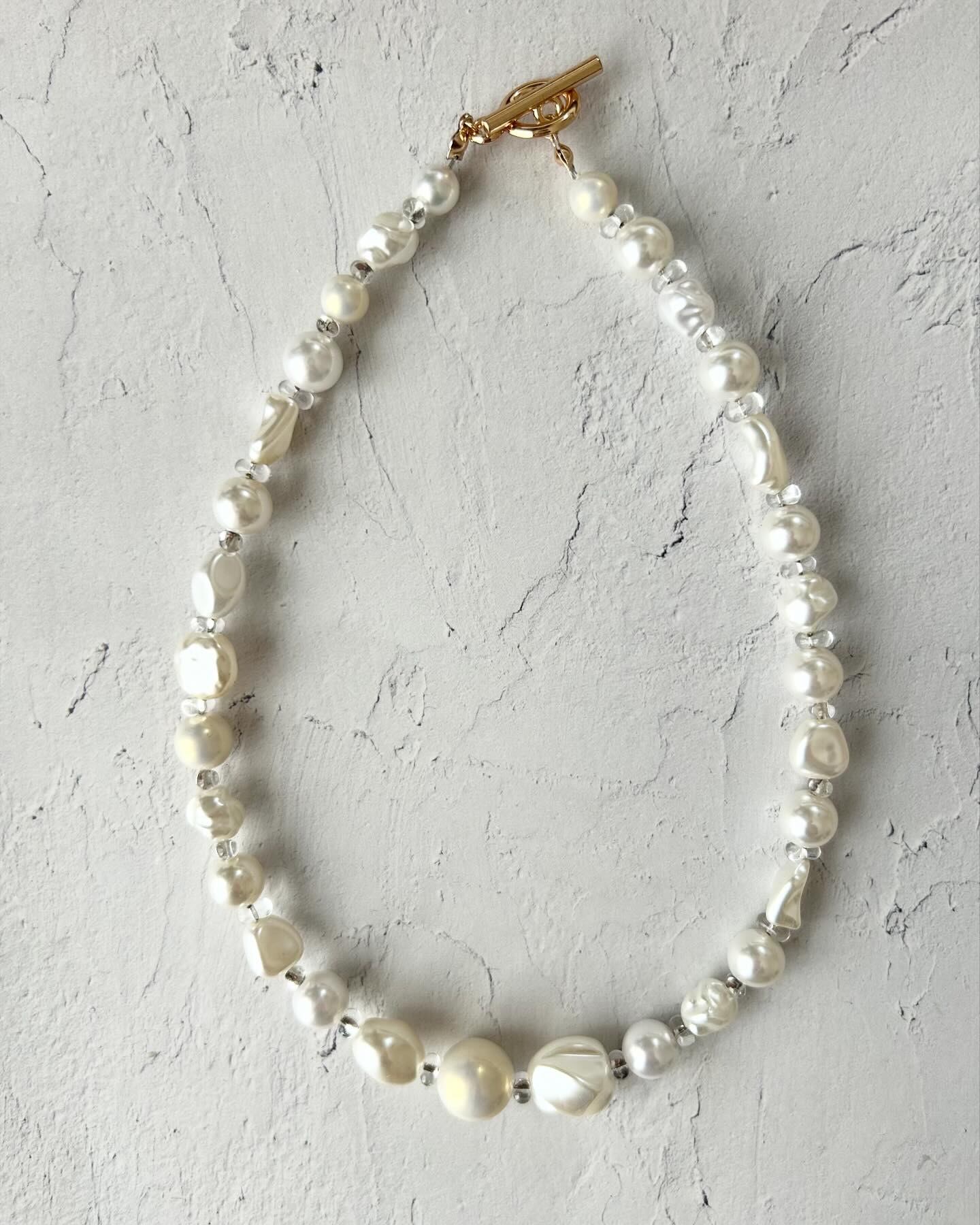 様々なパールを連ねた、シンプルコーデのアクセントにぴったりなショートネックレスです。