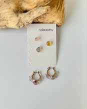 淡い春色が可愛い、コロンとした天然石ピアスと細石フープピアスのセットです。