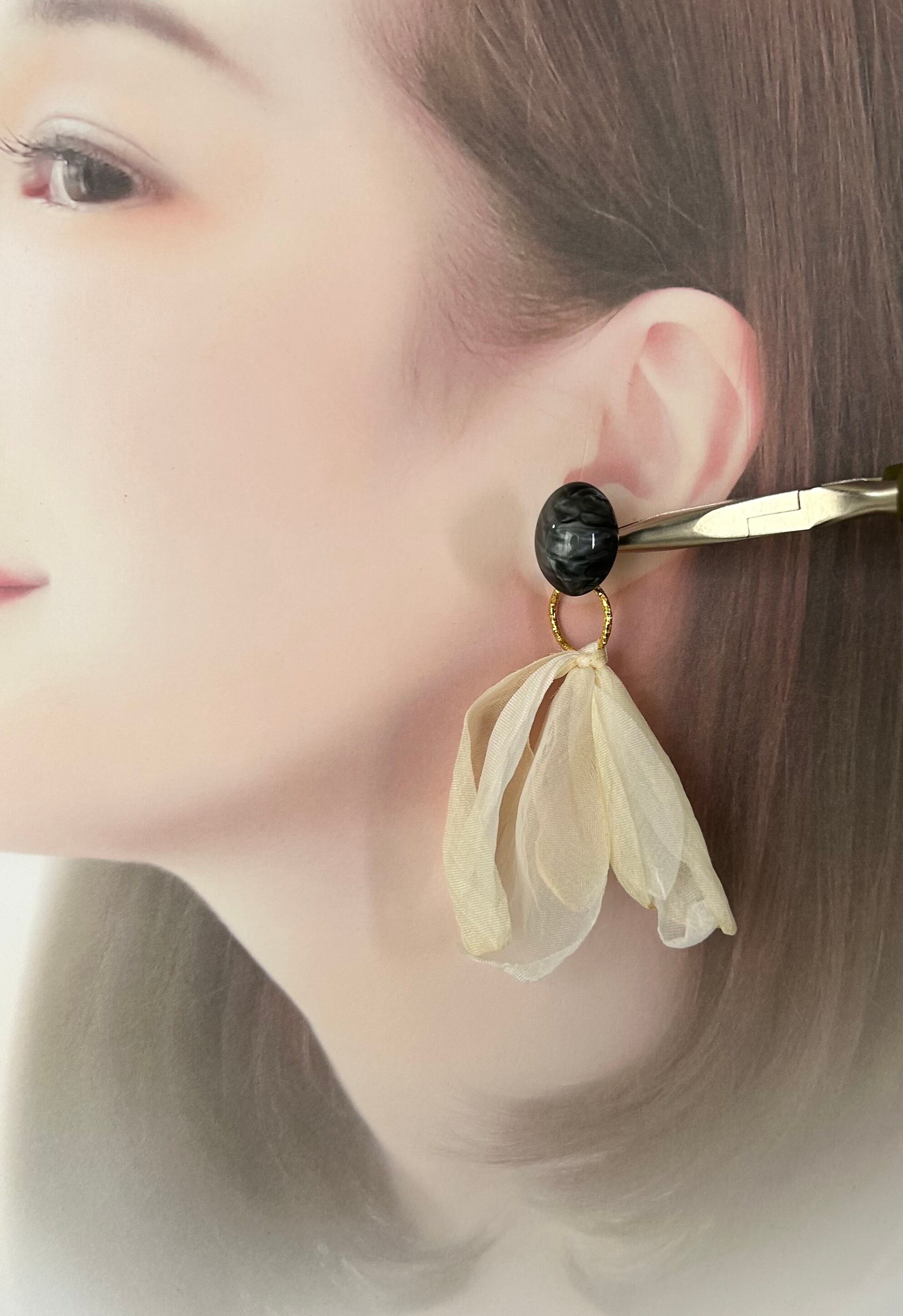 ダークグレーのvintageカボションにシフォンリボンを合わせた、主役級イヤリングです。