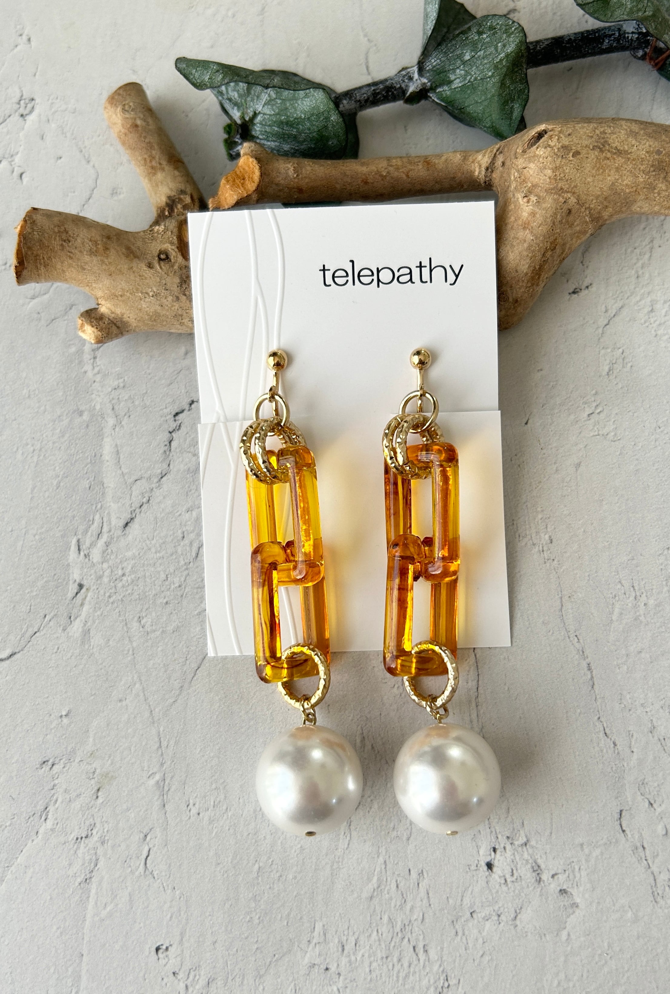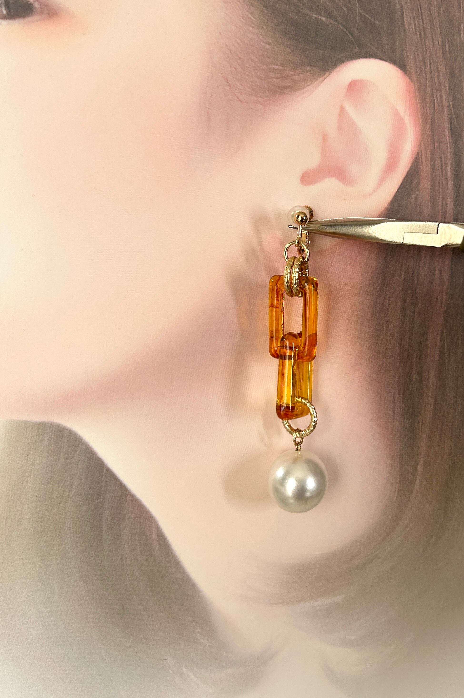 べっ甲カラーのvintageアクリルチェーンに18mm大粒イミテーションパールを合わせた、ブラックコーデにビタっとくる大ぶりイヤリングです。