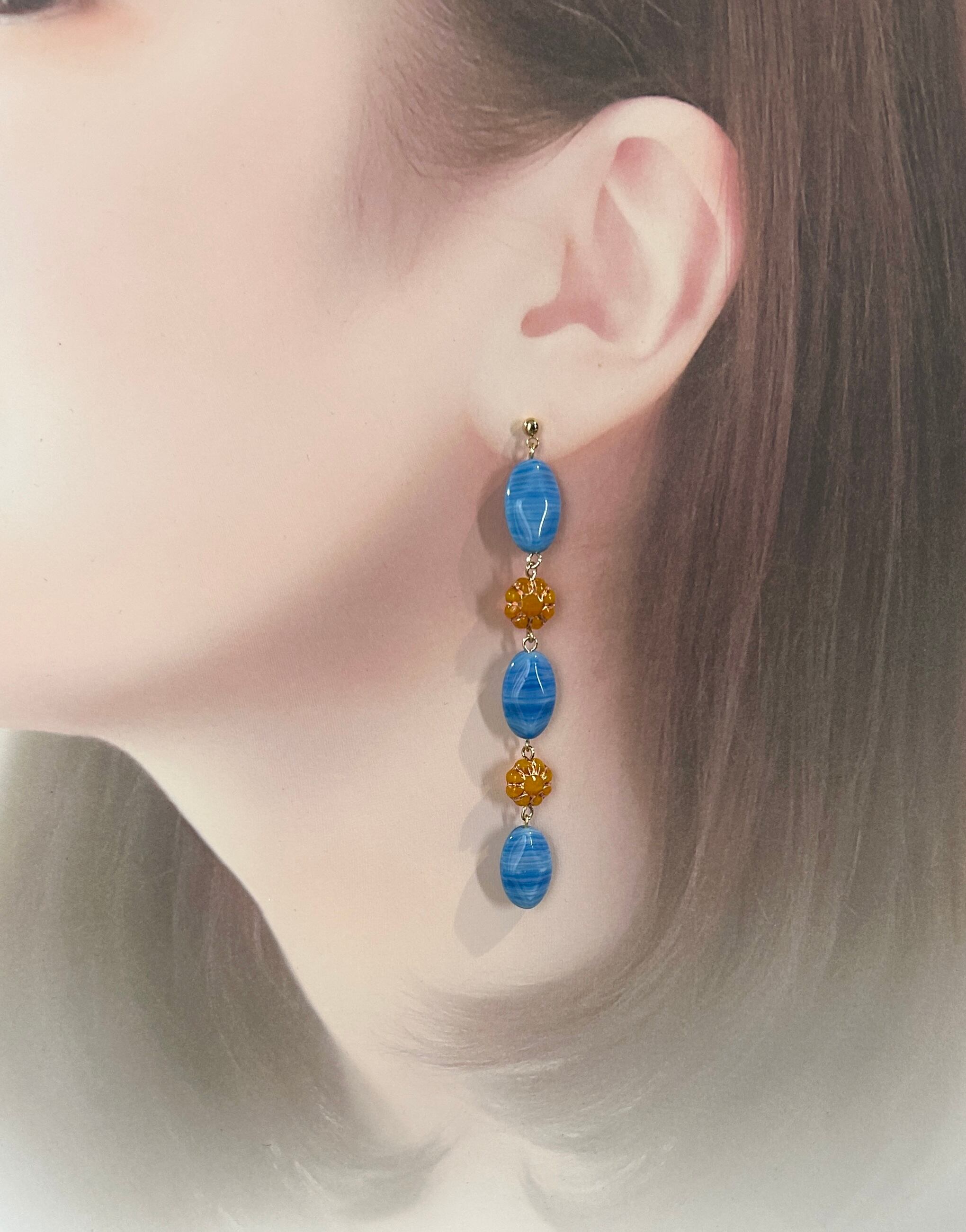 ライトブルー×オレンジが可愛い、耳元彩るチェコビーズピアスです。