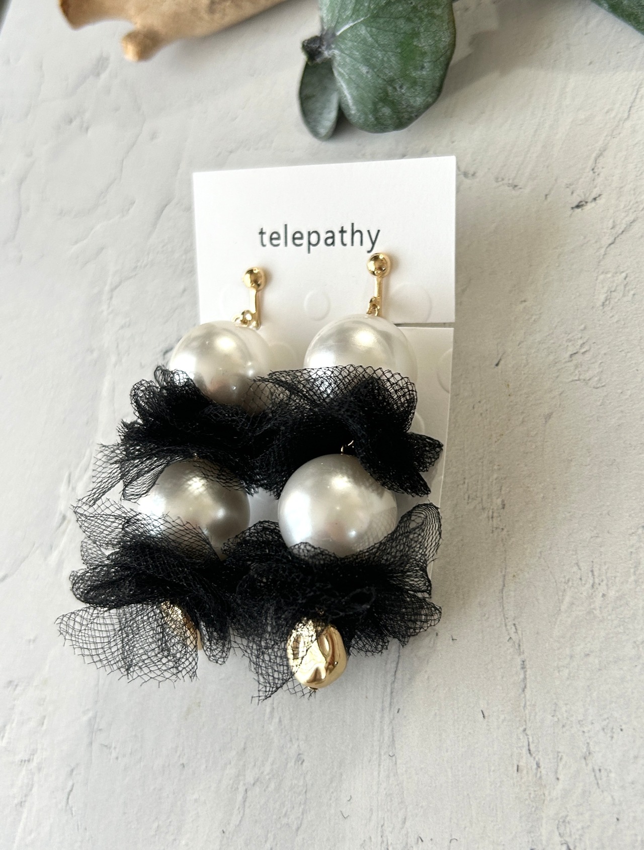 大粒イミテーションパールにブラックチュールをかませた、ボリュームが可愛い大ぶりイヤリングです。
