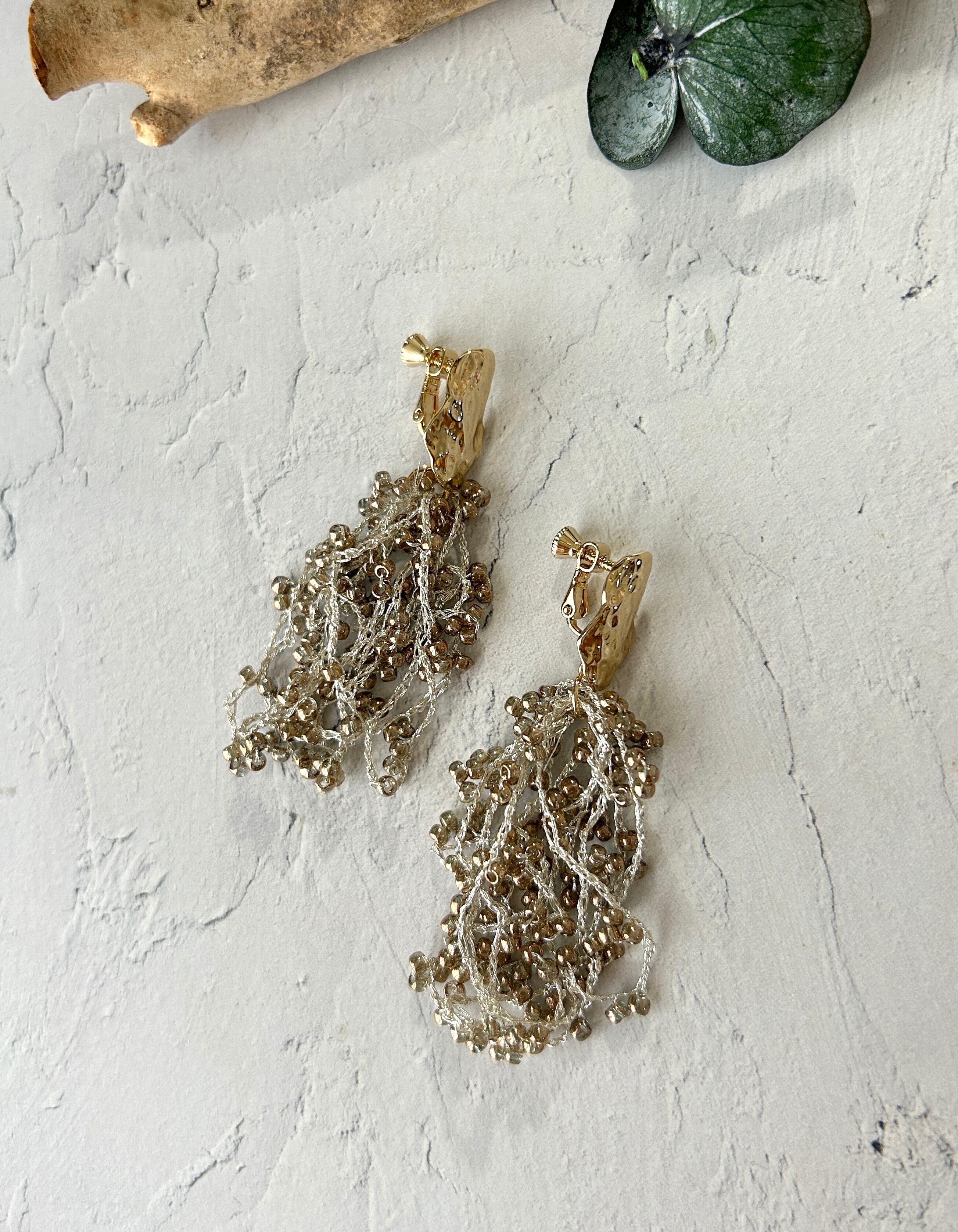 手作業でランダムに編み上げたビーズタッセルが、繊細でかっこいい大人イヤリングです。