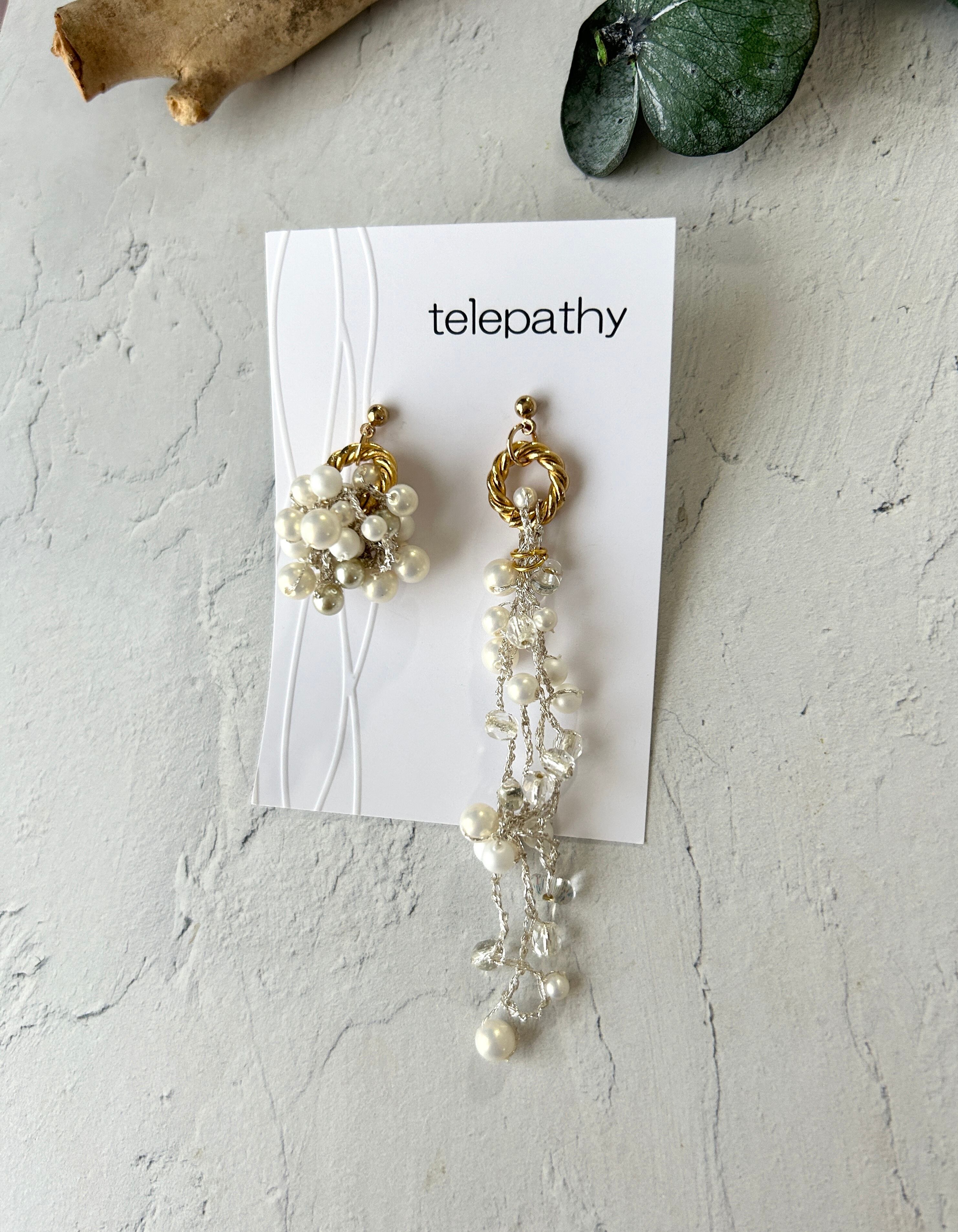 パール・ホワイト系・クリアビーズを編み上げ、繊細で大人なアシンメトリーピアスに仕立てました。
