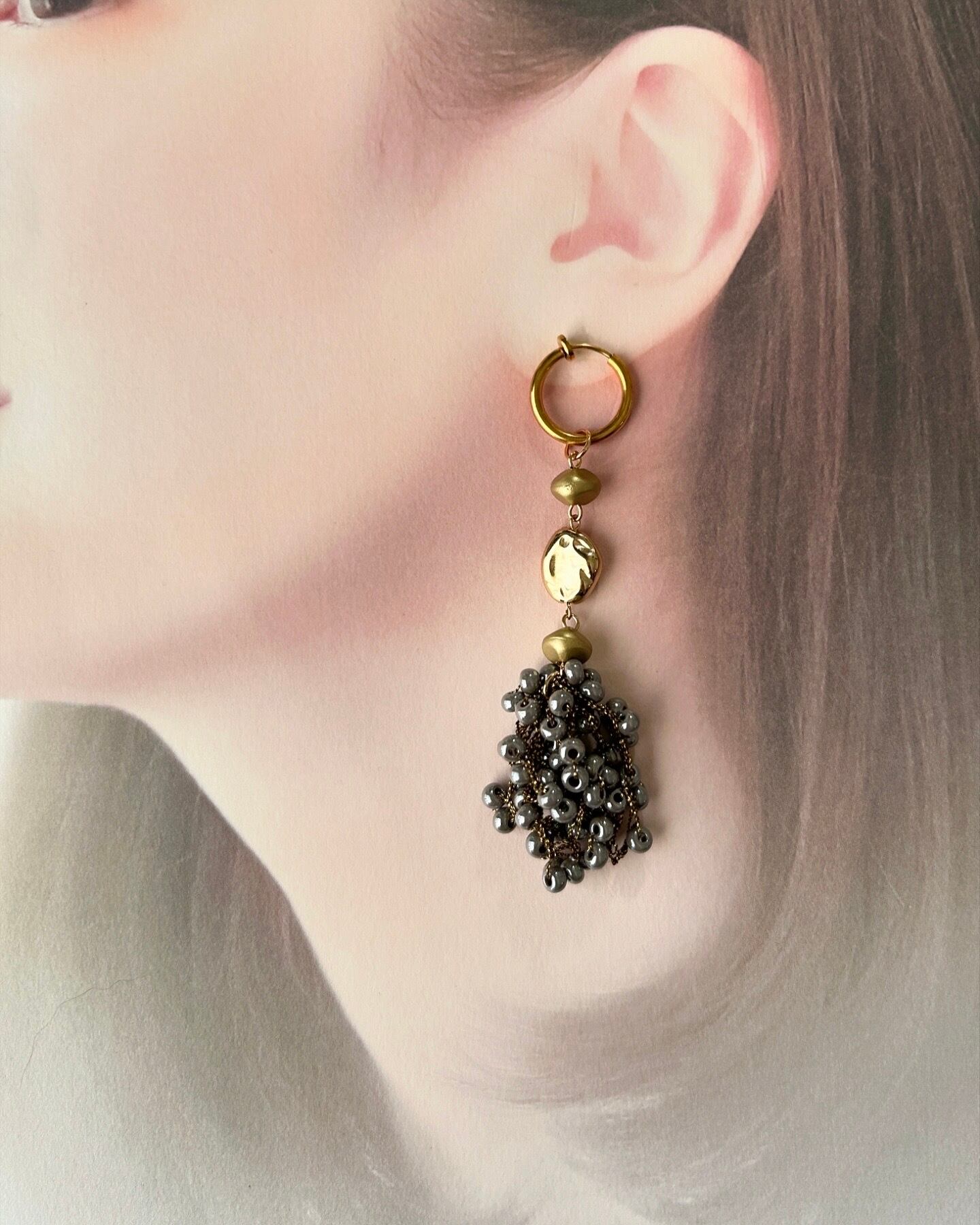 手作業でランダムに編み上げたビーズ刺繍タッセル(チェコビーズ使用)を、ヴィンテージライクな風合いに仕上げたフープイヤリングです。