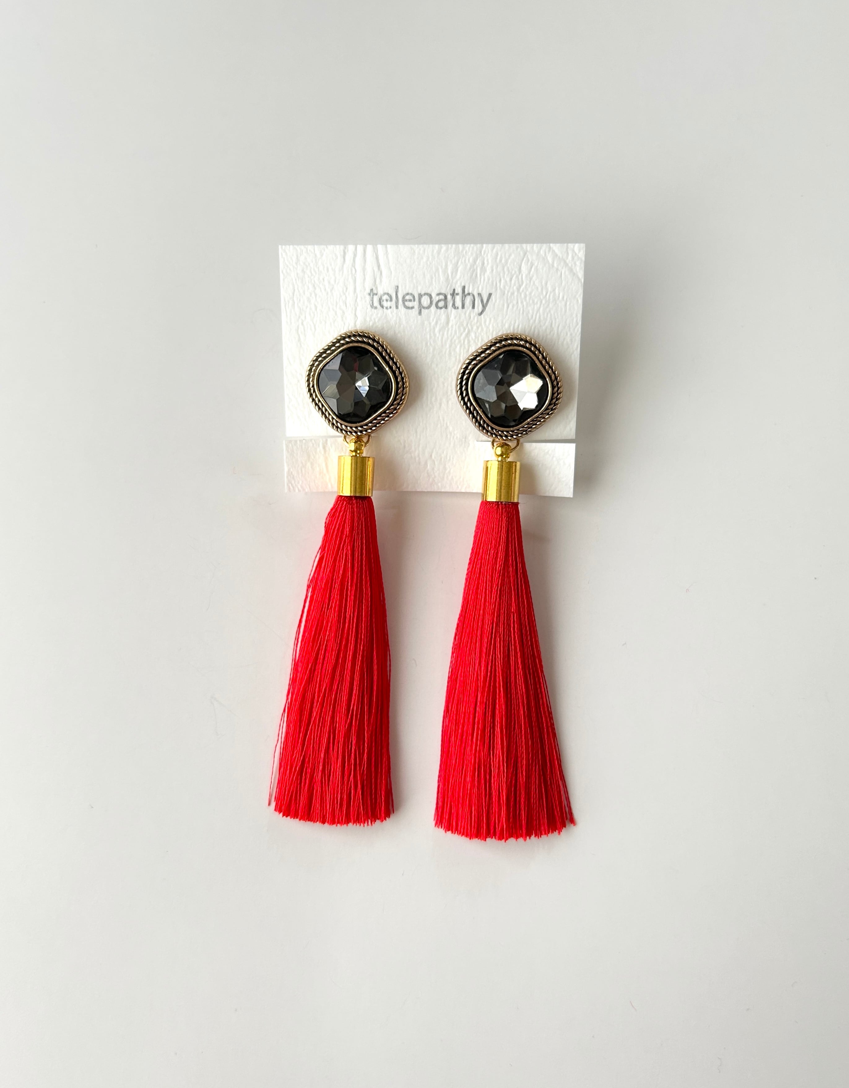 クラシカルなガラススクエアカボションに、鮮やかレッドのシルクサテンタッセルを合わせた、色を楽しむ大ぶりイヤリングです。