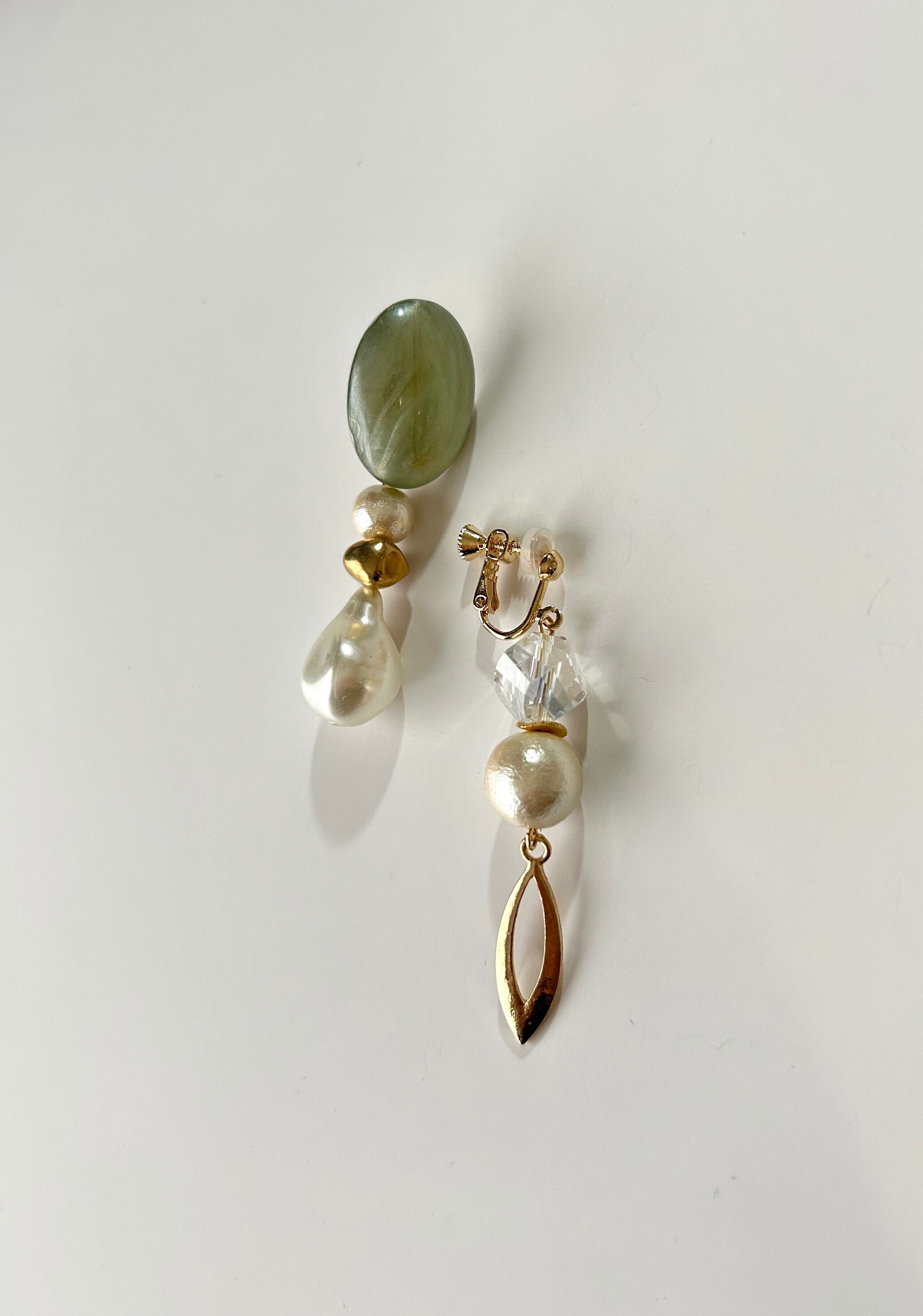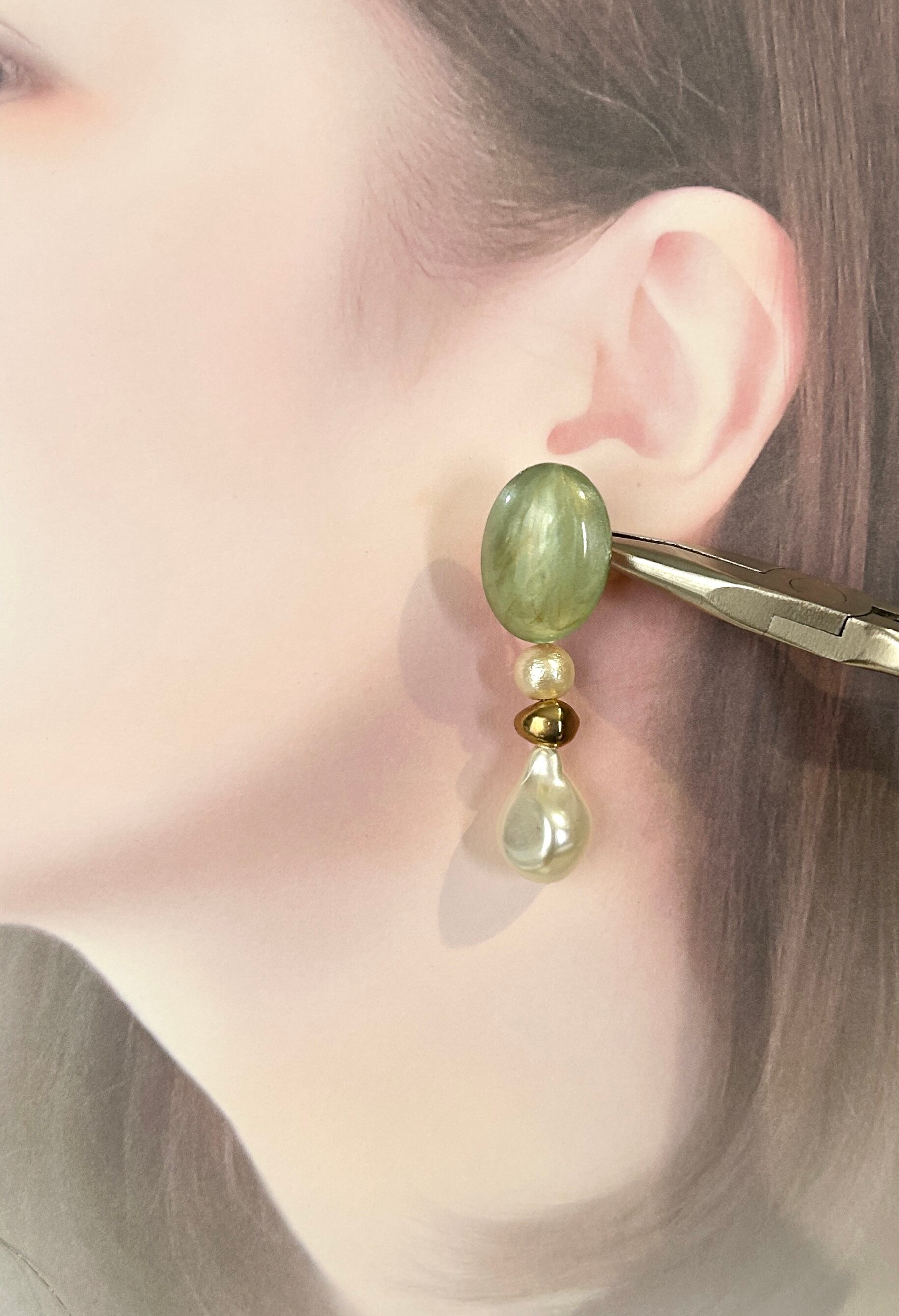 淡いグリーンマーブルのドイツ製vintageカボションにパールを合わせた、クラシカルな雰囲気のアシンメトリーイヤリングです。