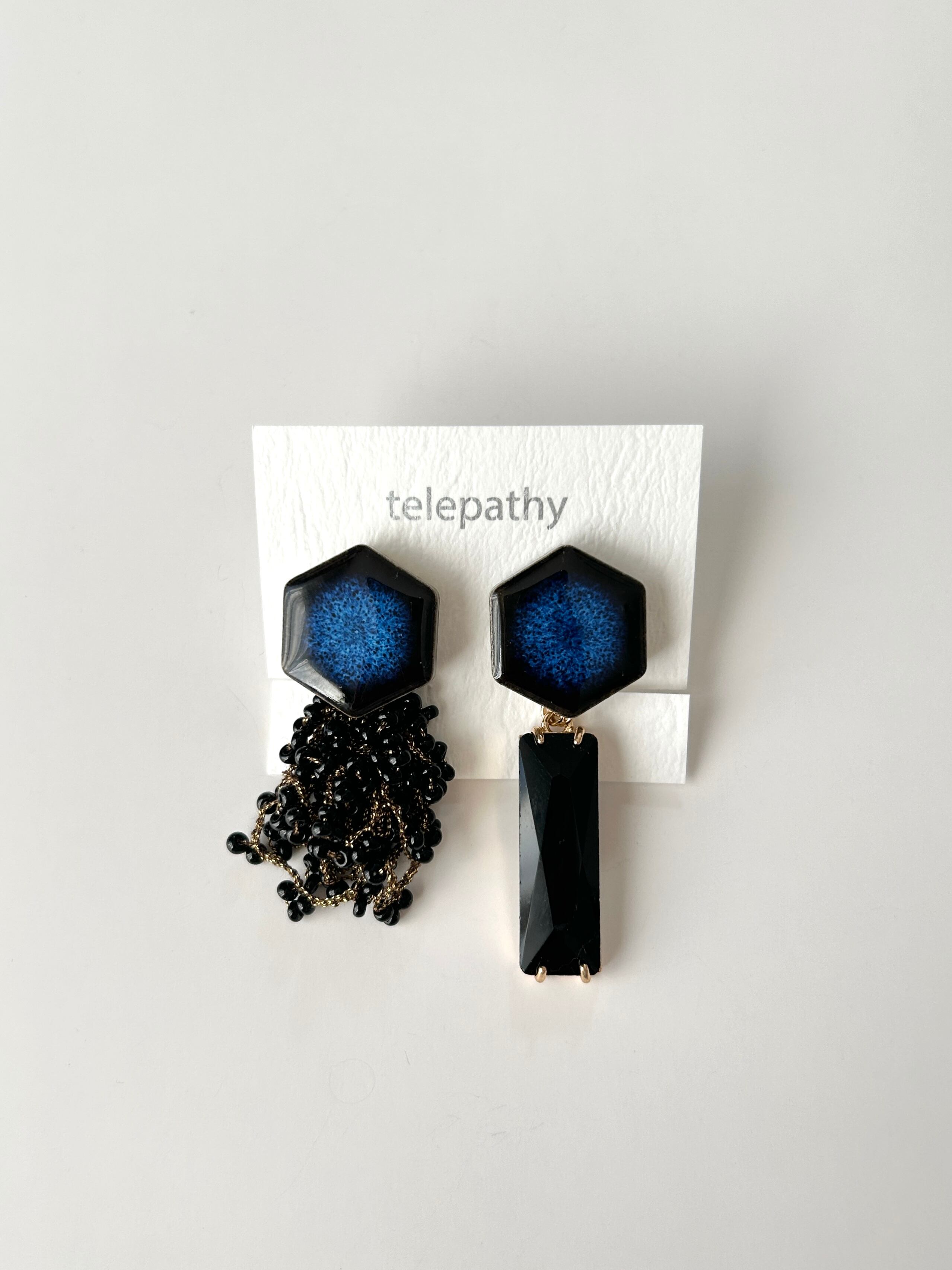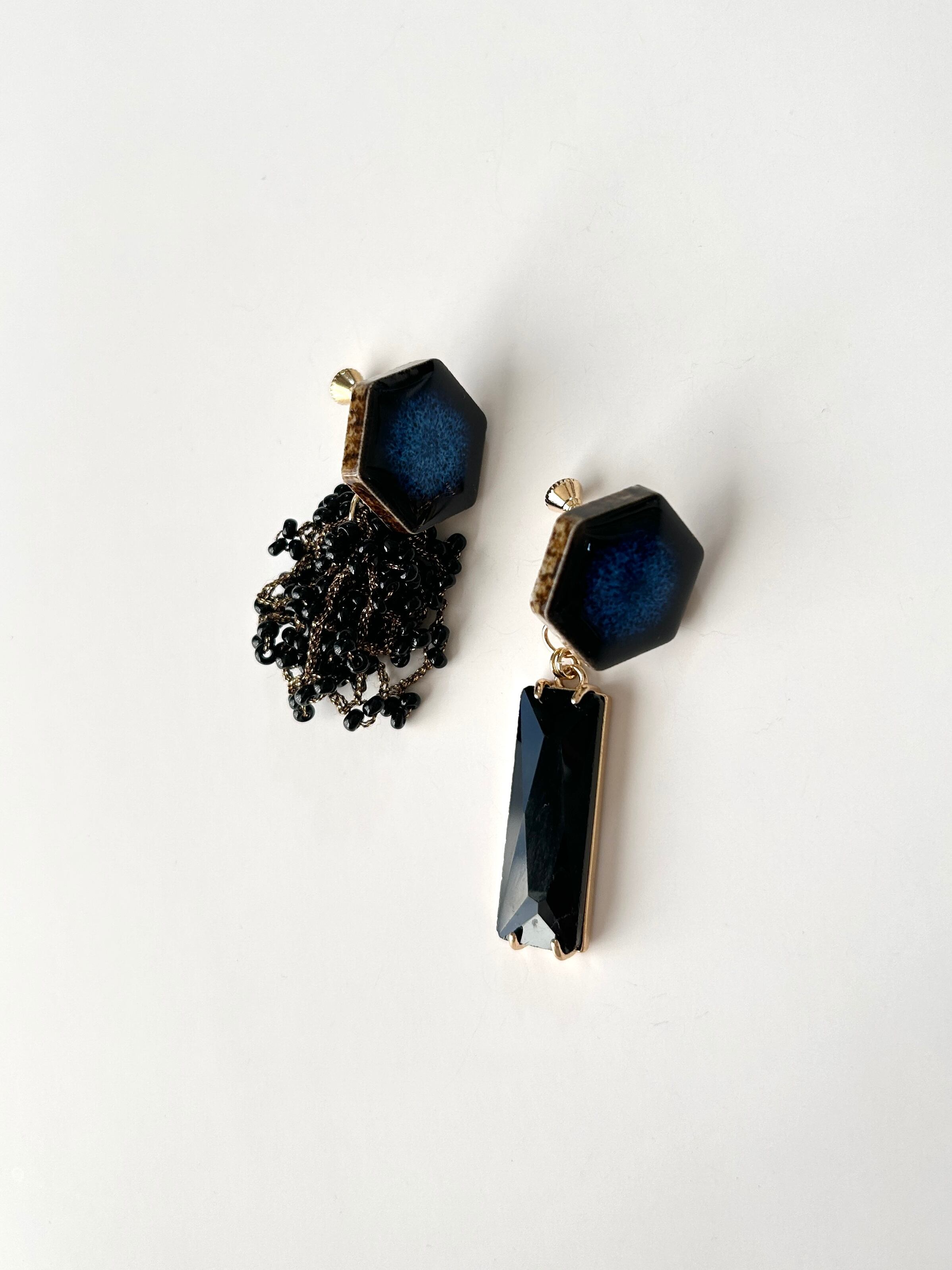 深いブルーが綺麗な美濃焼きタイル×ブラック、落ち着いた大人なアシンメトリーイヤリングです。