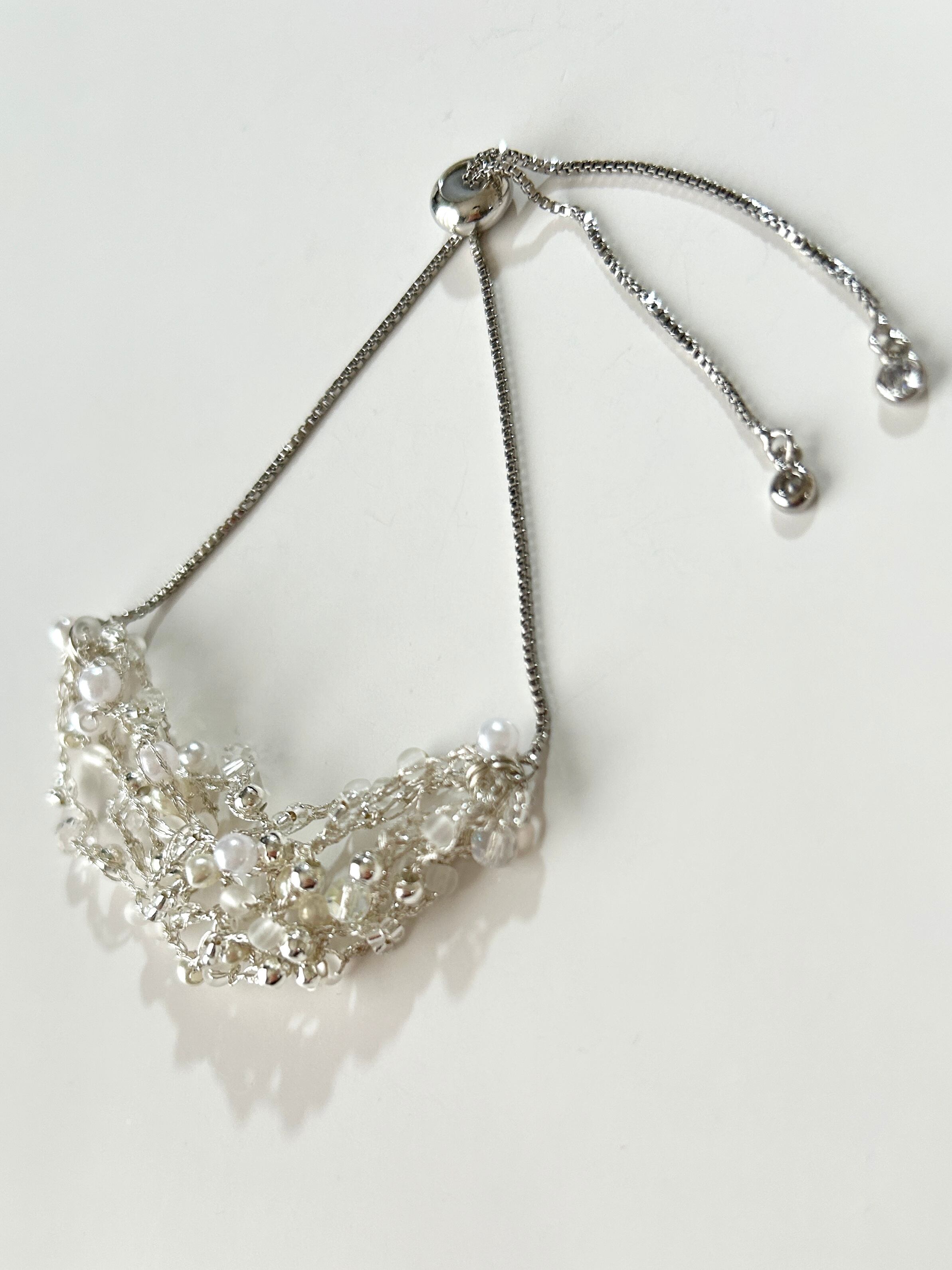 ガラスビーズやパールを銀糸で丁寧に編み込んでます。