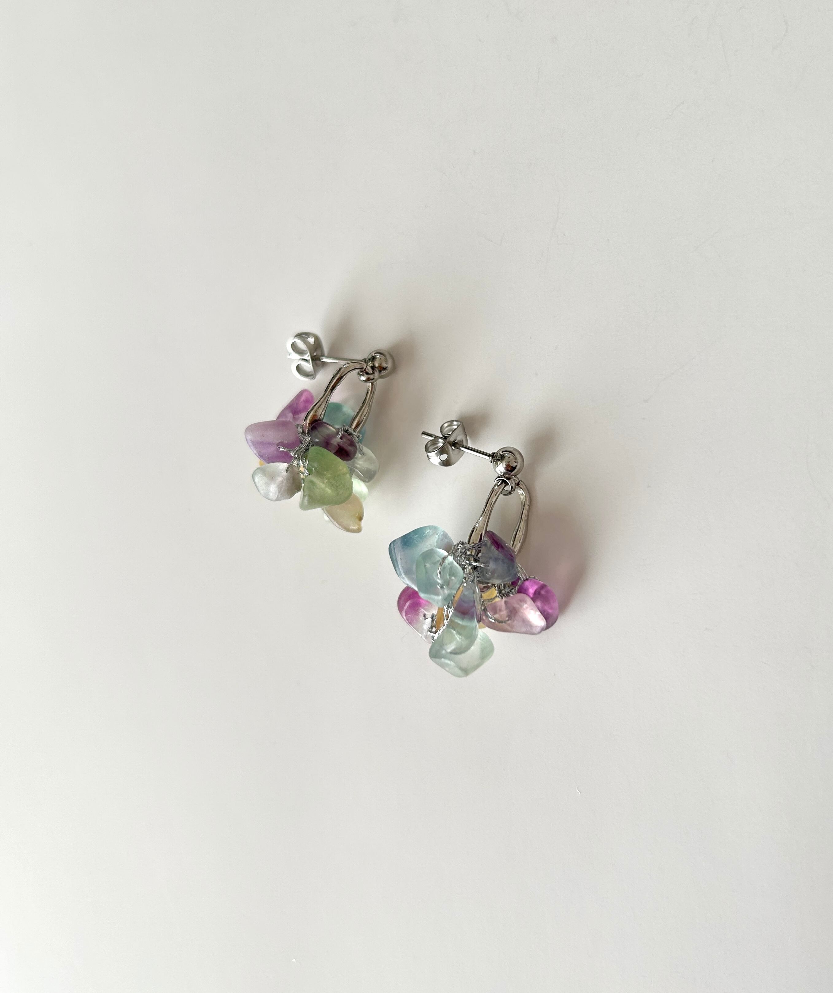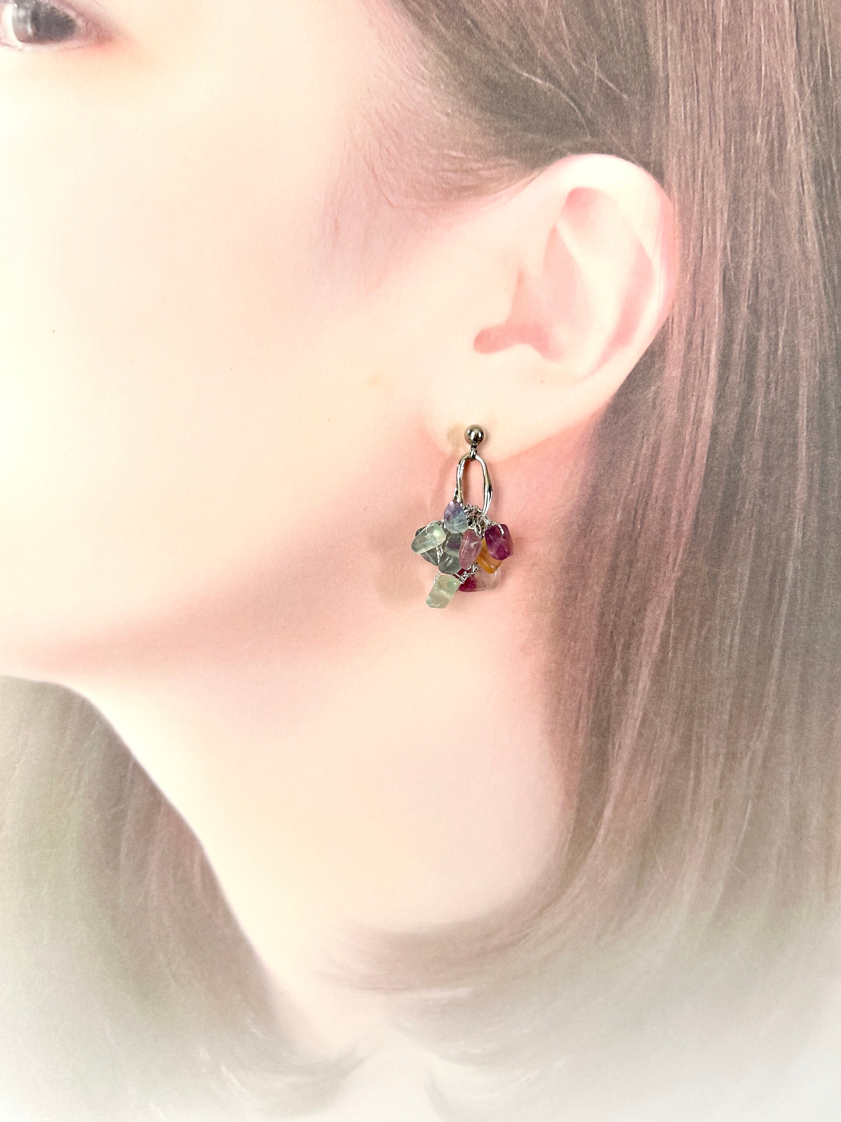 天然石とフロストガラスビーズを、銀糸で編み上げた、春が待ち遠しくなる大人ピアスです。