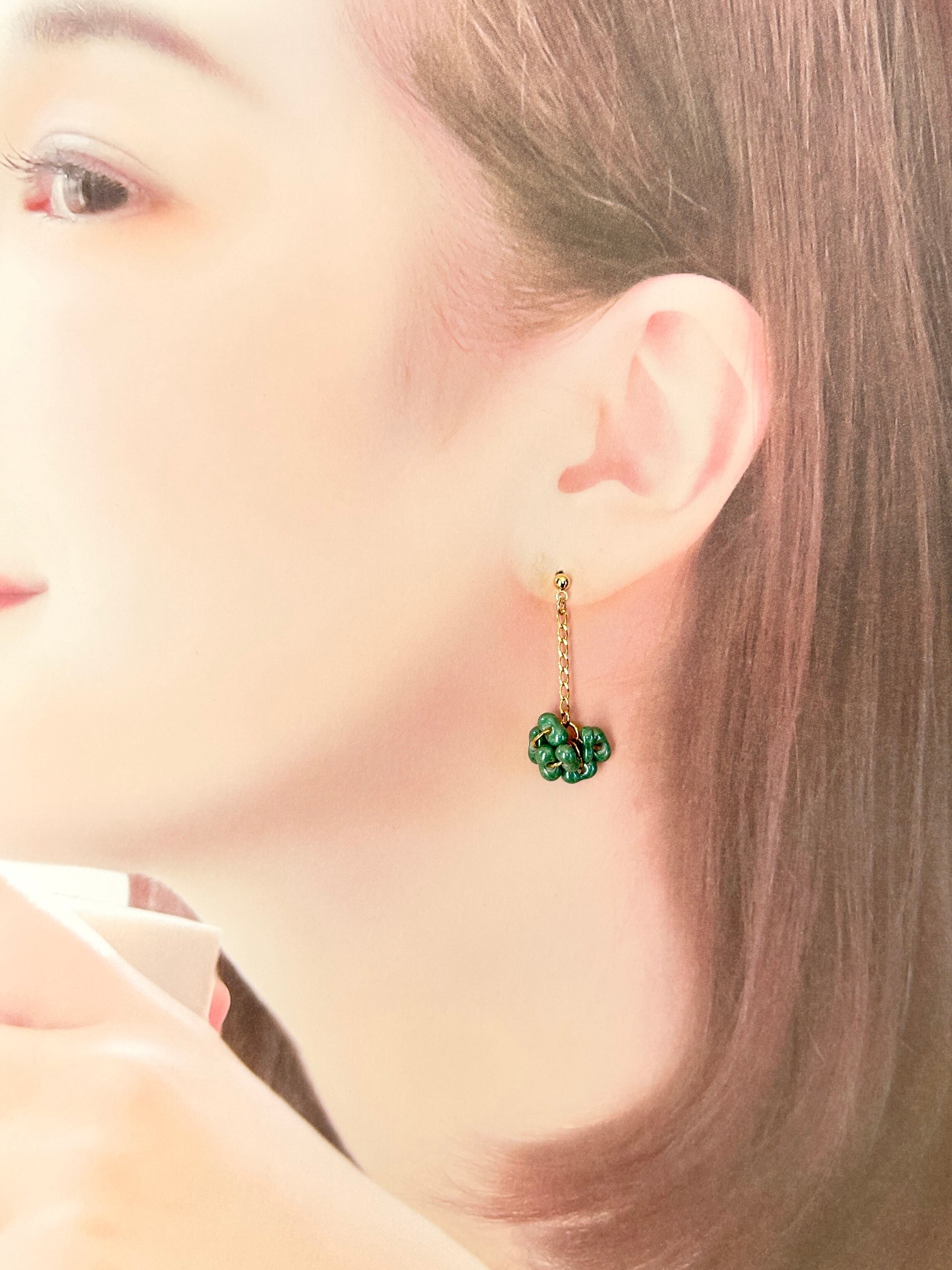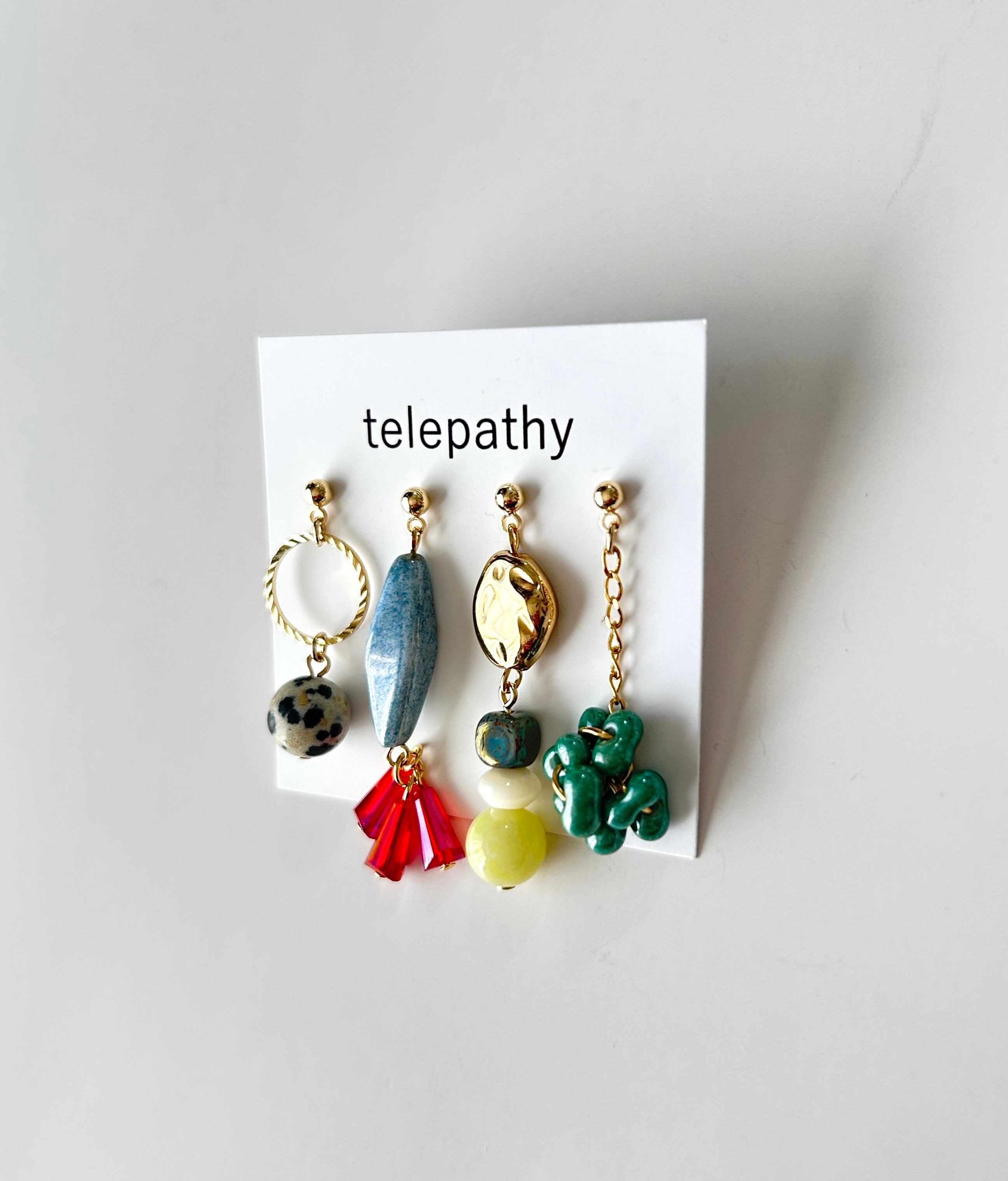 イヤーカフと合わせても可愛い、チェコビーズや天然石等を使用した、アシンメトリーピアスセットです。