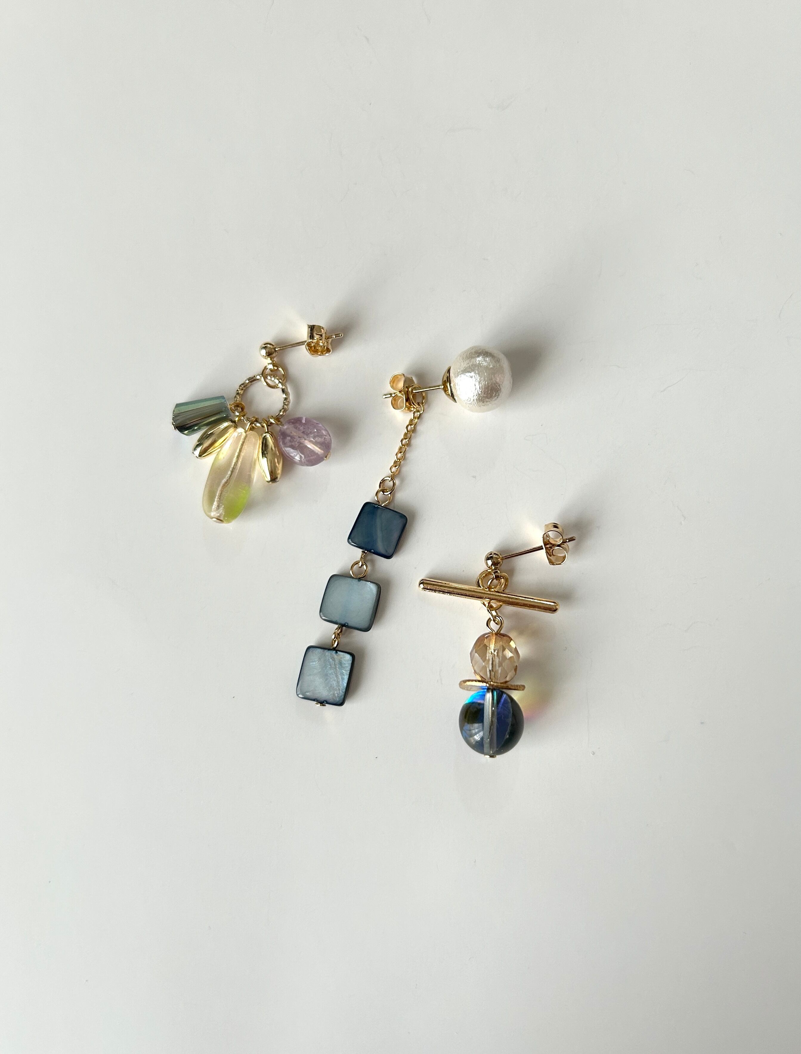 個性派デザインがかっこいい、コットンパールやシェル等を使用した、耳元コーデを楽しめるアシンメトリーピアスセットです。