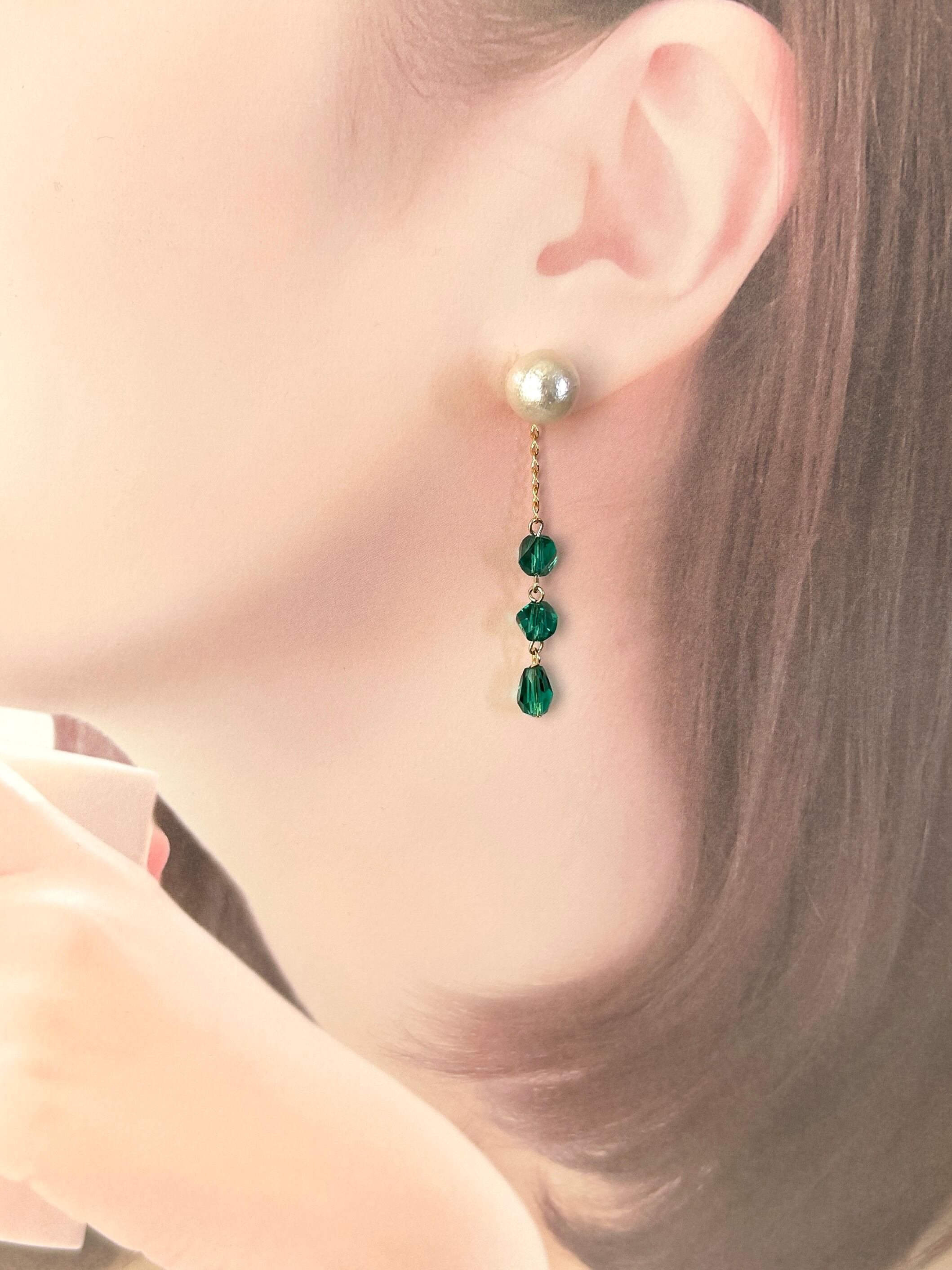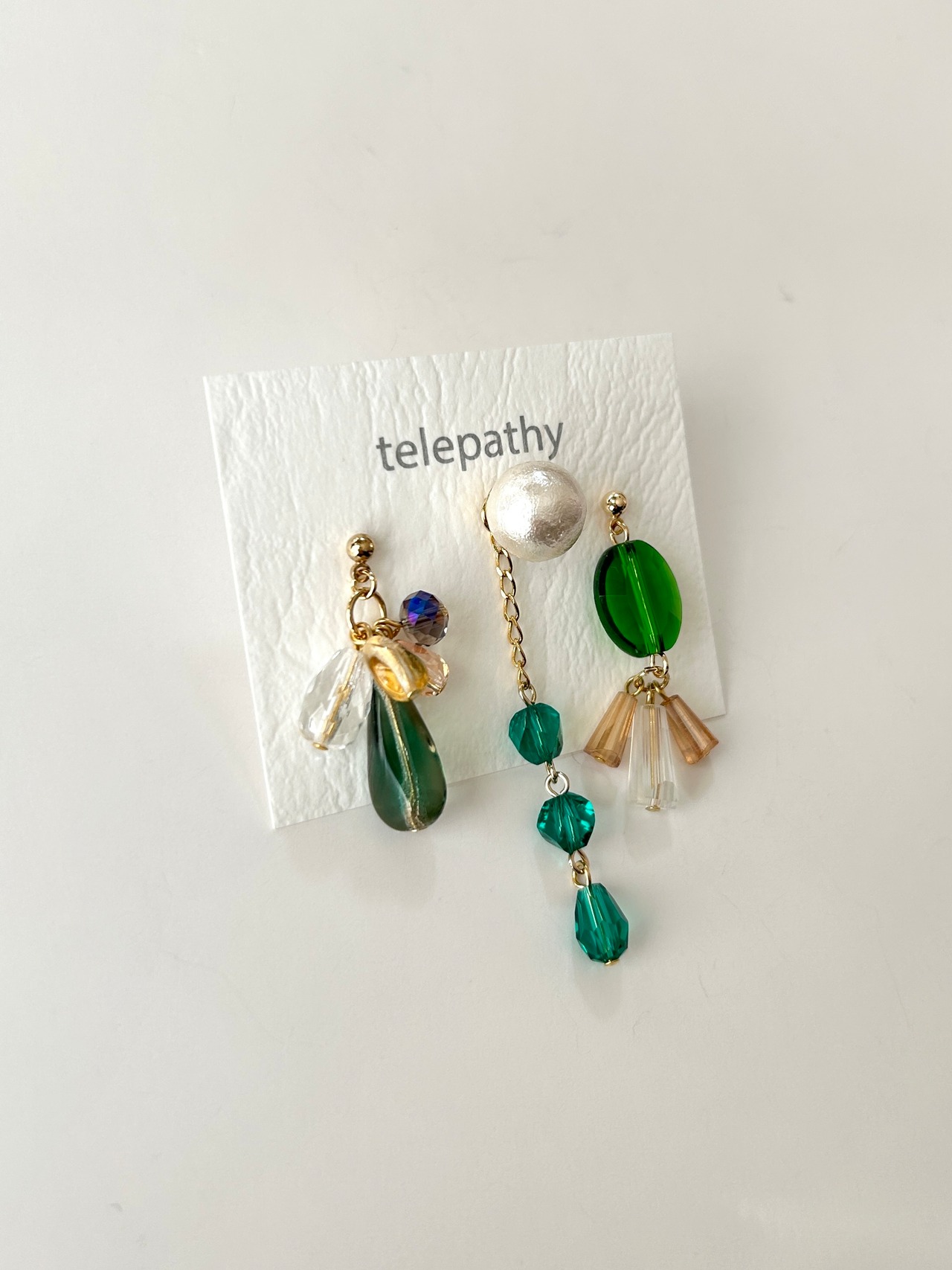 グリーンが繋ぐ、コットンパールやガラスビーズ等を使用した、耳元コーデを楽しめるアシンメトリーピアスセットです。